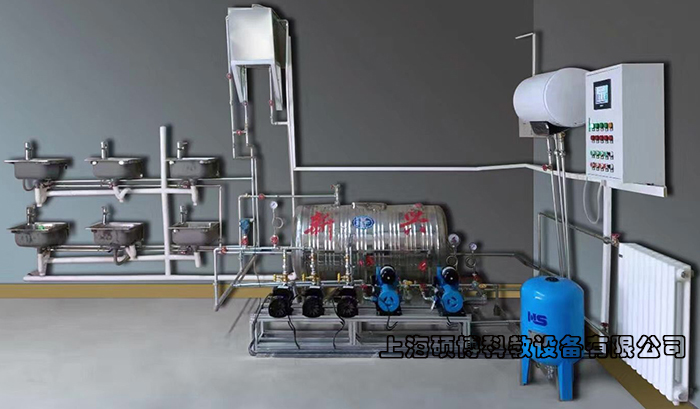 1、生活給水系統(tǒng):主要有給水箱、給水泵、給水管道、壓力變送器、脈沖水表、水龍頭和淋浴頭等組成。管路采用不銹鋼管進行設計,可進行不銹鋼管的切割、安裝和通水試驗操作,通過控制系統(tǒng)可實現(xiàn)生活給水系統(tǒng)的變頻恒壓供水功能,實現(xiàn)單泵變頻控制或雙泵切換控制等功能;通過脈沖式水表可以完成用水量的計量。