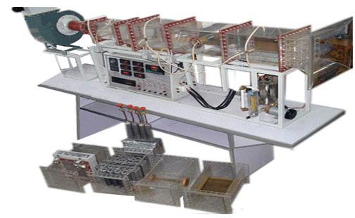 風機,自動調節(jié)風門,組合式有機玻璃風洞,有機玻璃實驗管段,有機玻璃叉排、順排實驗段,旋轉圓柱試件,紫銅平板試件,穩(wěn)壓電源配電位器調節(jié)加熱功率,電流表,電壓表,畢托管及差壓傳感器,PT100熱電阻測溫,巡檢儀顯示溫度、阻力、流量,不銹鋼臺架等。