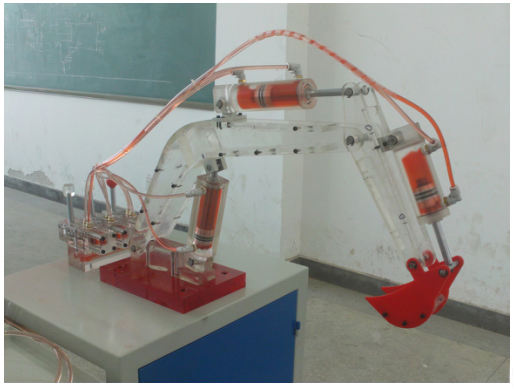 實(shí)訓(xùn)臺(tái)主要由底柜,透明大臂,透明斗桿,透明挖斗(紅色),透明油缸,透明集成閥島,透明手動(dòng)換向閥,透明電磁閥,旋缸馬達(dá),減速器等成