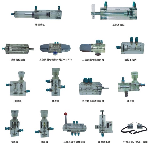 4、實(shí)驗(yàn)元件均為透明有機(jī)材料制成,便于了解掌握幾十種常用液壓元件的結(jié)構(gòu),性能及用途。掌握幾十種基本回路的工作原理,實(shí)驗(yàn)組裝回路快捷、方便。