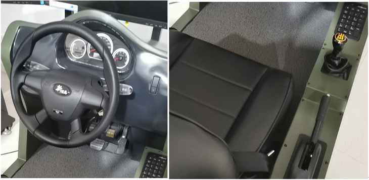 2)開放式艙體,方向盤、變速機(jī)構(gòu)、手制動、加油踏板、制動踏板、離合器踏板等實(shí)裝主要操作部件均需要模擬,其外觀尺寸、部署相對位置、操作行程,以及操作力度感受與實(shí)際基本一致,操縱機(jī)件性能工作可靠、操作靈活、低噪音。