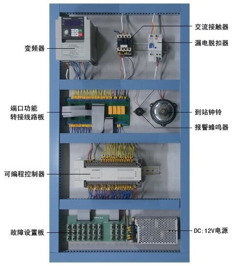 電梯的電氣控制系統(tǒng)采用PLC和交流變頻調(diào)速控制,其硬件結(jié)構(gòu)的組成及功能與實(shí)際電梯完全一樣。具有自動平層、自動關(guān)門、順向響應(yīng)轎內(nèi)外呼梯信號、直駛、電梯安全運(yùn)行保護(hù)以及電梯急停、慢上、慢下、照明、風(fēng)扇等功能,性能可靠、運(yùn)行平穩(wěn)、操作簡單、能耗低,特別適合于教學(xué)。此外,透明仿真教學(xué)電梯的軟硬件均采用開放式結(jié)構(gòu),因此,院校也可以利用此套裝置進(jìn)行二次開發(fā)研究。