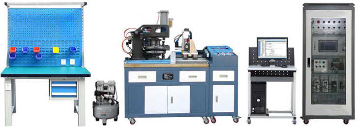 本實訓(xùn)裝置主要由實訓(xùn)臺、電氣控制柜(包括氣動模塊、電源控制模塊、可編程控制器模塊、變頻器模塊、觸摸屏模塊、步進(jìn)電機(jī)驅(qū)動模塊、伺服電機(jī)驅(qū)動模塊、電氣擴(kuò)展模塊等)、動力源(包括交流減速電機(jī)、步進(jìn)電機(jī)、交流伺服電機(jī)等)、機(jī)械傳動機(jī)構(gòu)、十字工作臺、自動送料機(jī)構(gòu)、八角形模架、模具、自動打刀缸機(jī)構(gòu)、操作臺、裝配及檢測工具、型材電腦桌等組成。