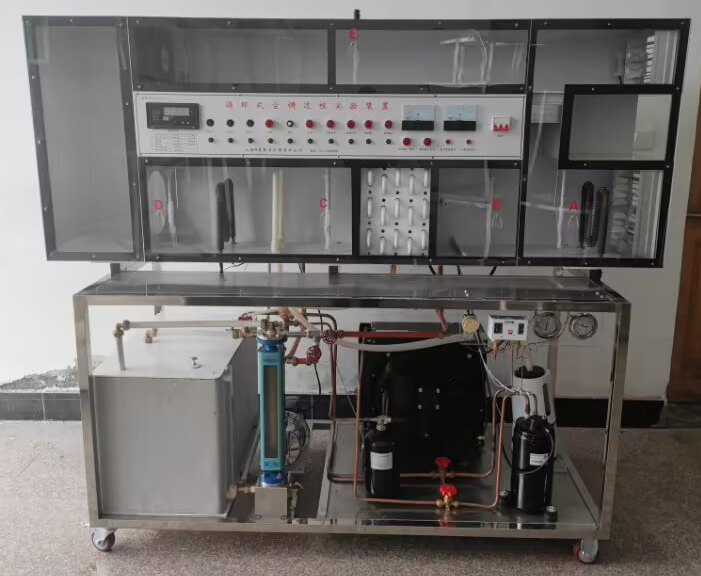 空氣熱濕處理實(shí)驗(yàn)裝置為《空氣調(diào)節(jié)》課程實(shí)驗(yàn)教學(xué)設(shè)備,用它可以模擬不同季節(jié)室內(nèi)和室外的環(huán)境和空氣處理調(diào)節(jié)的方法,進(jìn) 行集中式空調(diào)系統(tǒng)不同循環(huán)形式的空氣調(diào)節(jié)實(shí)驗(yàn)。還可以 做變風(fēng)量運(yùn)行調(diào)節(jié)實(shí)驗(yàn)和制冷系統(tǒng)的參數(shù)測(cè)定及其調(diào)節(jié)實(shí)驗(yàn)。裝置具有透明風(fēng)管,可直觀地觀察和測(cè)試。實(shí)驗(yàn)裝置的 結(jié)構(gòu)由空氣循環(huán)系統(tǒng)、加濕器、加熱器、冷卻器及其冷水 機(jī)組和相應(yīng)的測(cè)試儀表等組成。可以實(shí)現(xiàn)對(duì)空氣的加熱、冷卻、加濕和除濕(表冷式和淋水式可互換使用)等處理。 在實(shí)驗(yàn)中,還可以對(duì)空氣的溫度、濕度、流量進(jìn)行測(cè)量,并 能對(duì)加溫器、加熱器的輸入電功率進(jìn)行測(cè)定,從而可以計(jì)算各空氣處理過(guò)程中的熱量和濕量得失,以及進(jìn)行熱、濕平衡 的分析。