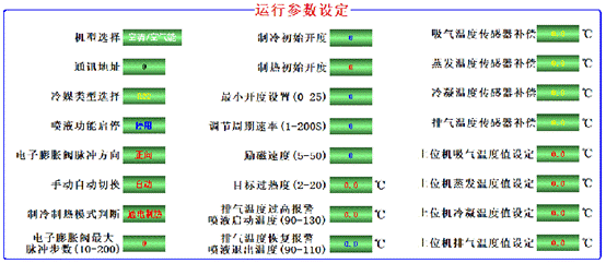 11)顯示界面上29 路參數(shù)控制參數(shù)設(shè)置/查詢:控制器內(nèi)所有與控制相關(guān)的溫度參數(shù)、時(shí)間參數(shù)、控制參數(shù)、等29個(gè)參數(shù)都可以調(diào)整,以適應(yīng)制冷/熱泵/冷庫/水機(jī)等設(shè)備。