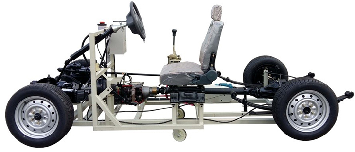 包括前后懸掛系、轉向系、傳動系、手動變速器及掛檔機構、制動系等系統(tǒng)、安裝腳輪的可移動式臺架等組成。