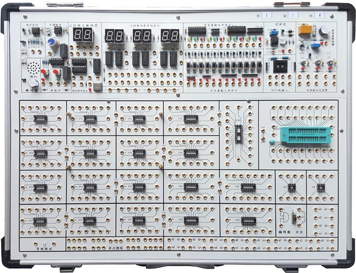 數(shù)字電路實驗箱,數(shù)字電路實驗室,數(shù)字邏輯實驗箱、數(shù)字電路實驗裝置、主要用于開設電子信息科學與技術、自動化和機電一體化三個專業(yè)的《數(shù)字電子技術實驗》或《數(shù)字電子技術基礎實驗》課程,該課程是相應的《數(shù)字電子技術》或《數(shù)字電子技術基礎》理論課程中重要的實踐環(huán)節(jié)。課程的任務是通過實驗,使學生加深對所學理論課程內容的理解,激發(fā)學習興趣,從實踐上驗證所學的理論知識;培養(yǎng)學生的實際動手能力、解決問題能力和設計數(shù)字電子電路的初步能力。數(shù)字電路實驗箱由鋁木合金箱體、開關電源、常用信號源和實驗電路區(qū)組成。其中實驗電路區(qū)采用全開放模式,可根據需求靈活配置實驗電路,以滿足不同層次學生的教學實驗要求。