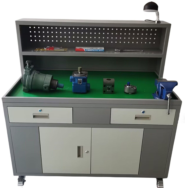 6、實訓(xùn)臺:采用鈑金結(jié)構(gòu)設(shè)計,表面為雙層亞光密紋噴塑工藝處理,臺面采用下凹設(shè)計,增加臺虎鉗,以及絕緣防滑墊,同時為液壓閥拆裝時提供一個良好的接油、防震平臺。